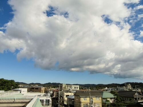 台風一過の朝、というには少々、遅めですが・・・鎌倉上空は秋空に雲が輝いています(朝から輝いていたと思う、たぶん)。 海岸部に近い某集合住宅屋上より北方を望む。雲の下、低い山の向こうが北鎌倉でしょうか。まったく関係ないけれど、そういえば昔、雲…