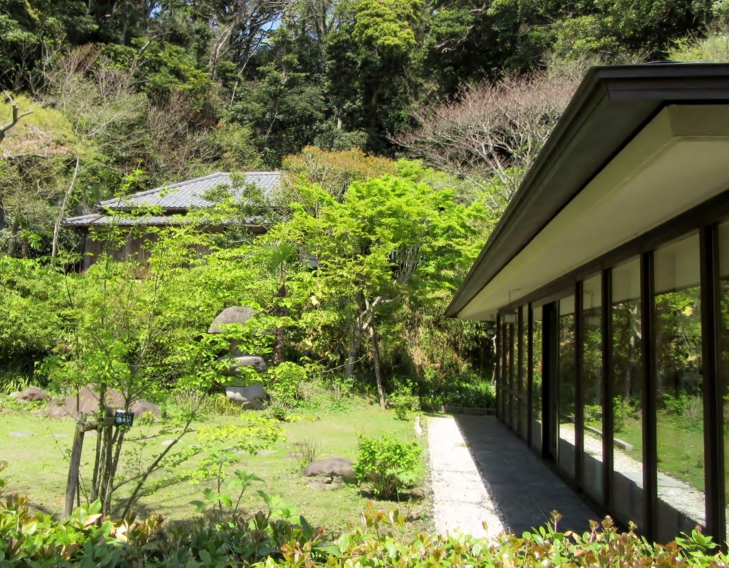 鎌倉市雪ノ下の川喜多映画記念館。映画会に多大な功績があった川喜多長政、かしこ夫妻の旧宅が鎌倉市に寄贈され、映画記念館になっています。右のガラス張りの建物が記念館。奥に屋根だけ見える木造家屋は旧和辻哲郎邸を移築したもので、ゲストハウスとして使われ、アラン・ドロンも訪れたそうです。敷地の長い屏の内側に通路が設けられ、お庭を見ながら通り抜けできるようになっています。