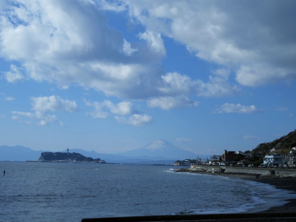 2018-01-06 海晴れて 稲村ケ崎 冬の富士 ビギナーズ鎌倉 寒い、寒いと言われていたわりには穏やかなお天気でしたね。ぽかぽか陽気に誘われて稲村ケ崎に繰り出しました。元日には雲に隠れて見えなかった富士山に再チャレンジしよう・・・。 見えました。江の島、富士山、そして七里ガ浜。空には雲。ただし、ご覧の通り、富士山はかなりかすんでいます。もう昼過ぎだからしょうがないか。アップにすればもう少し、はっきりと・・・。 あまり変わりませんね。午後は海から水蒸気が上がってくるのでしょうか。