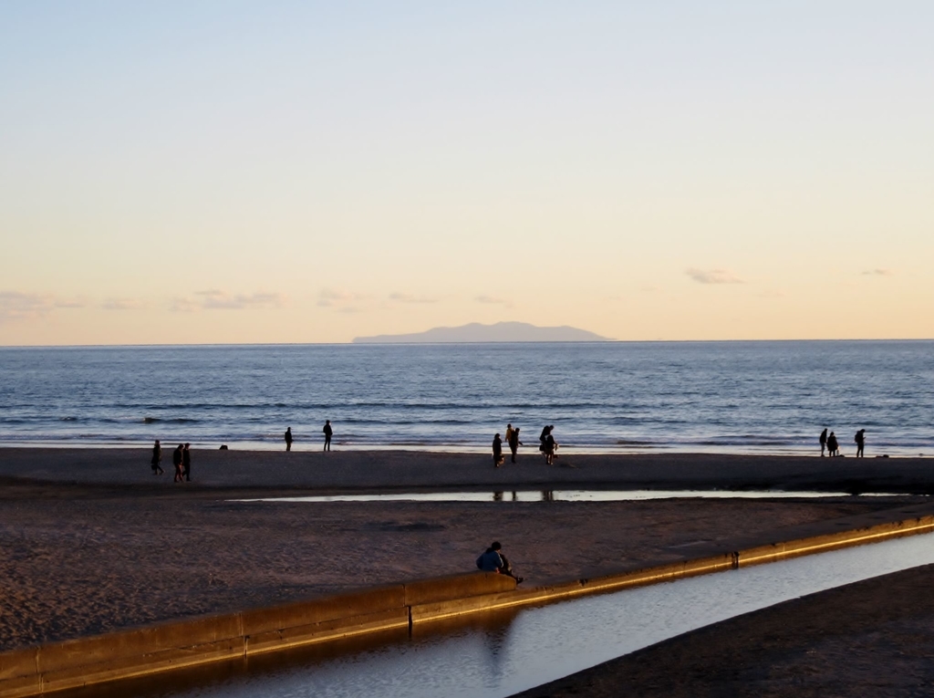 こちらは伊豆半島に沈む夕日。比較的温暖な日曜日だったので、砂浜にはたくさんの人が繰り出していますね。