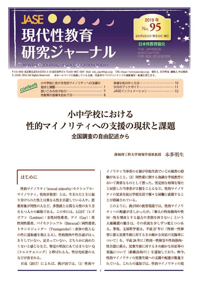 現代性教育研究ジャーナルのNo95(2018年2月15日発行)にコラム『多様な性のゆくえ One side/No side』の22回目が掲載されました。こちらは表紙ですね。不肖・私のコラムは10ページに載せていただきました。