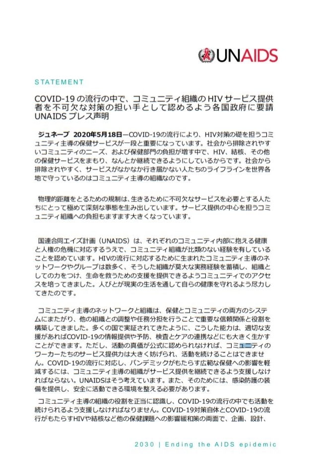 国連合同エイズ計画(UNAIDS)のプレス声明『COVID-19の流行の中でHIVコミュニティワーカーは対策の不可欠な担い手』は5月19日付の当ブログでも紹介しましたが、コミュニティセンターaktaの協力を得て、新たに日本語PDF版を作成しました。API-Net(エイズ予防情報ネット)に掲載されているのでご覧ください。